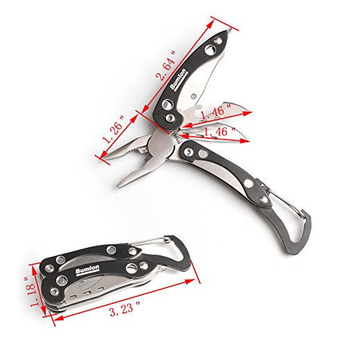 - Needle nose pliers, wire cutters, can opener, small knife blade, serrated edge, a mini Philips head screwdriver, and a stays-in-place clip