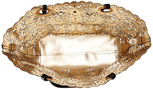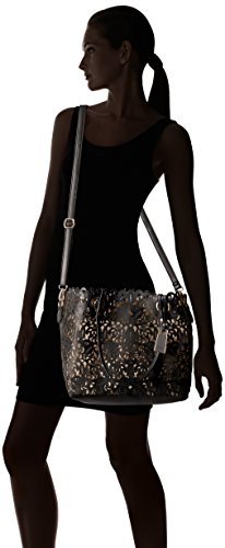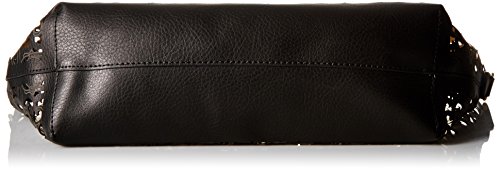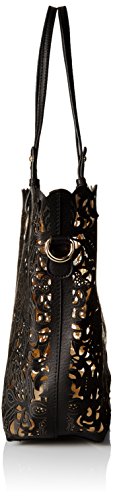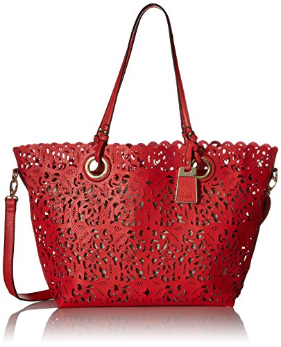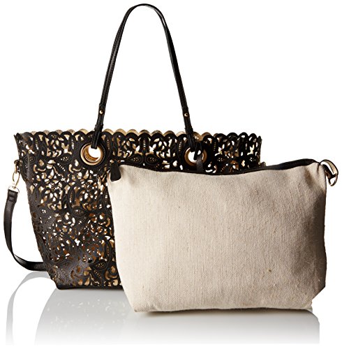 Large tote bag in laser-cut faux leather featuring coordinating removable zip-top pouch