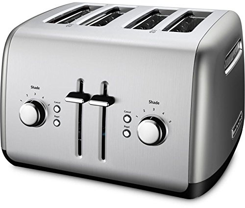 4-slice toaster with manual high-lift lever Extra-wide, 1.5'' slots Chrome button with blue back-light illumination when in use Dual independent controls Dual bagel buttons for single-sided toasting Dual dial shade control with 5 settings Durable all-metal construction Removable crumb tray Under base cord storage