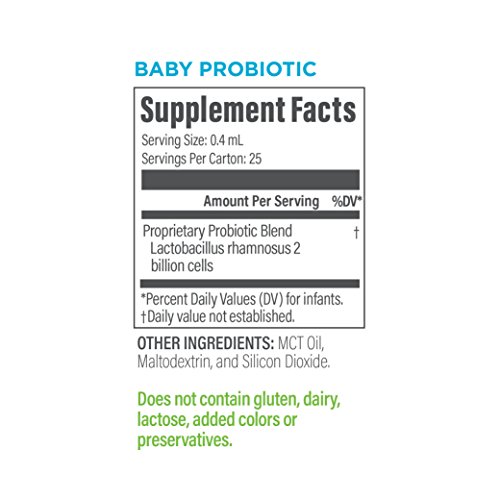 Serving size: 1 dose (0.4 mL) daily. Package contains 25 servings. Includes easy to use dropper to administer probiotic liquid drops to baby. Refrigerate after opening. Pediatrician recommended to relieve occasional colic symptoms, gas, constipation and other digestive related issues.