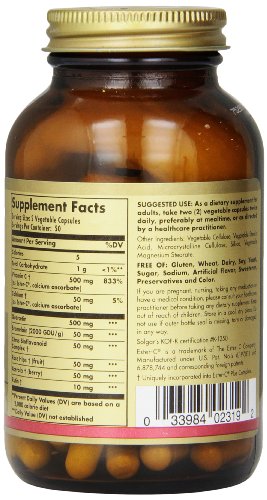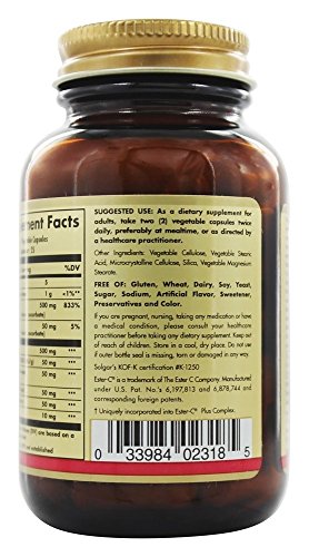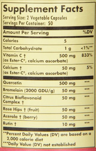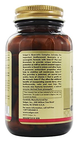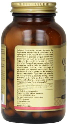 -. Binding : Health and Beauty -. Brand : Solgar -. Color : Parent -. Feature : 2 Bottles of 100 Vegetable capsules / Has antioxidant properties which help to stabilize cell membranes / Patented, PH neutral (non acidic), form of vitamin C that is gentle on the stomach / Offers the additional benefits of incorporating acerola berry, citrus bioflavonoids, rutin and rose hips and also features bromelain -. IsAdultProduct : 0 -. Label : Solgar -. Manufacturer : Solgar -. PackageQuantity : 1 -. ProductGroup : Health and Beauty -. ProductTypeName : HEALTH_PERSONAL_CARE -. Publisher : Solgar -. Studio : Solgar -. Title : Solgar - Quercetin Complex with Ester