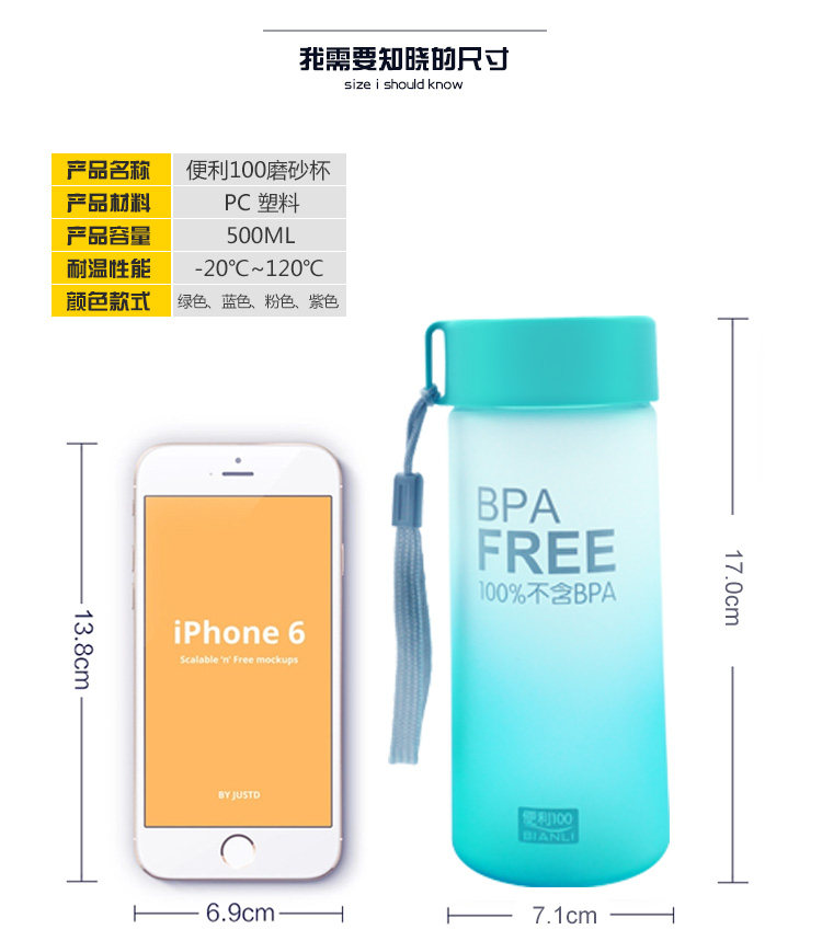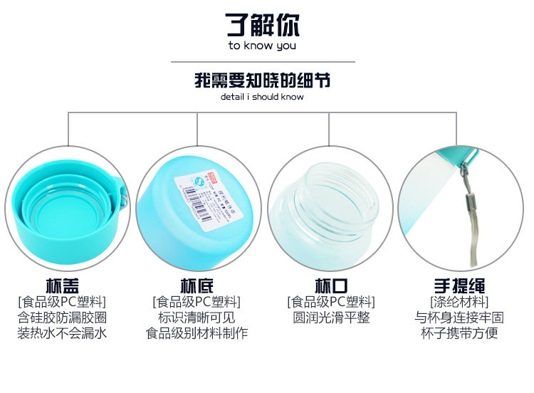 杯子采用食品级别PC塑料,安全可靠,耐冷耐热-10℃到120℃,容量500ml,高17cm,宽7.1cm