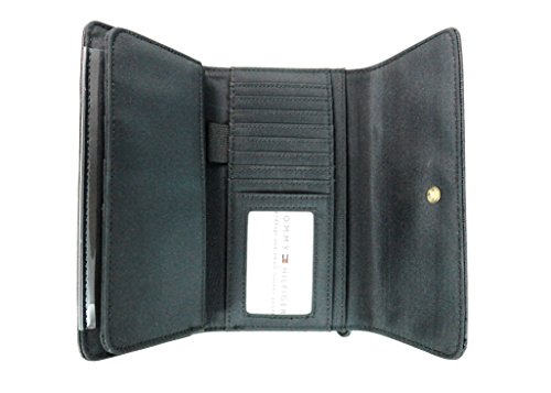TOMMY HILFIGER BLACK SAFFIANO STUDS CONTINENTAL CHECKBOOK CLUTCH WALLET Wallet features a double snap closure *The wallet measurements are 7" wide x 4" high *Front has Tommy Hilfiger gold-tone logo buckle and studs detail in front *Back features a full length coin purse *Inside has 3 slip pockets for your bills. *Wallet has room for 8 credit cards and 1 ID holder *Gold Tone Hardware & Accents Pen holder *Removable Checkbook holder