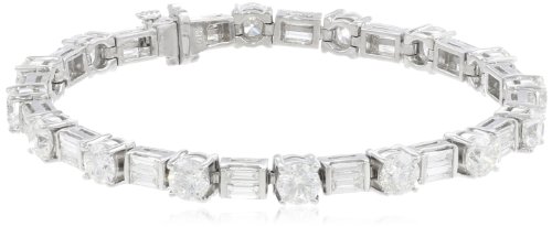 Choose a look of pure luxury with this stunning diamond tennis bracelet, offered in your choice of 14 karat white or yellow gold. It showcases a line of sparkling round and double baguette diamonds, arranged in an alternating pattern in prong and channel settings. There are 16 round and 32 baguette diamonds altogether in this radiant piece, for a total diamond weight of 10.63 carats. The mix of diamond shapes creates a subtle pattern and a beautifully distinctive look. Expertly constructed for a graceful drape, the 7-inch bracelet is finished with a tongue-in-groove clasp and safety bar.Feature