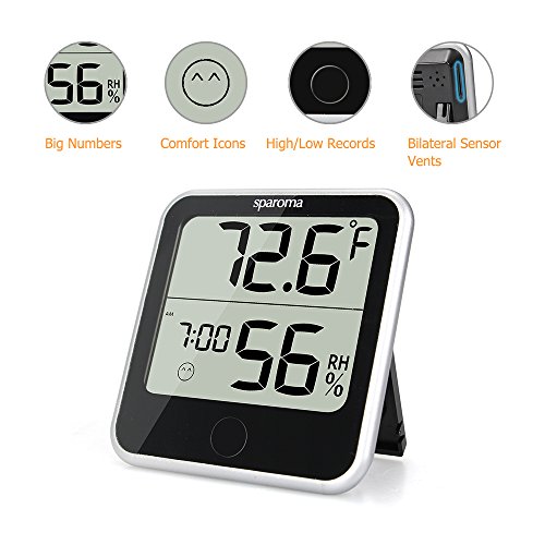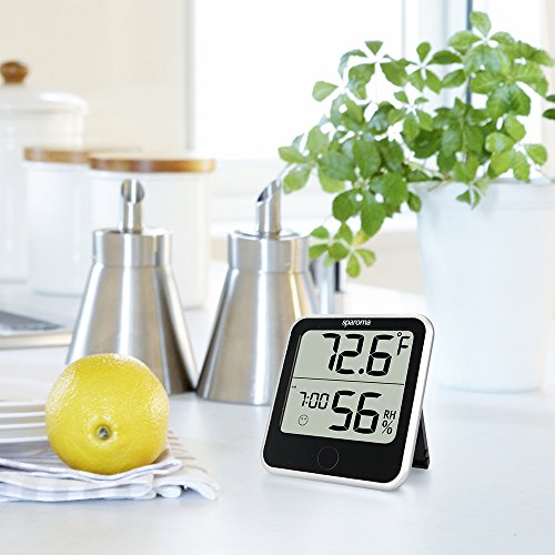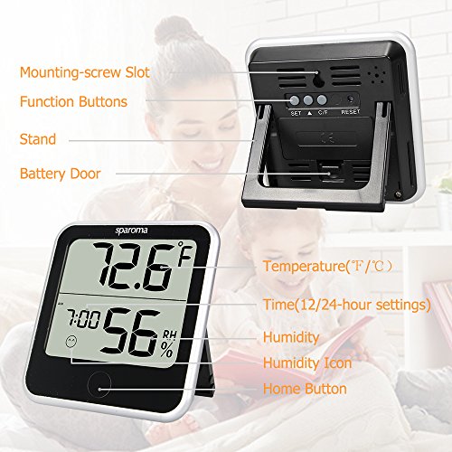 Sparoma Hygrometer Thermometer:With Temperature Gauge, Humidity Meter and Built-in Clock, Sparoma humidity monitor is able to measure the indoor temperature, humidity timely. Humidity monitor helps you know the weather and make you prepared for it. Sparoma understands you well in the health care of your whole family.