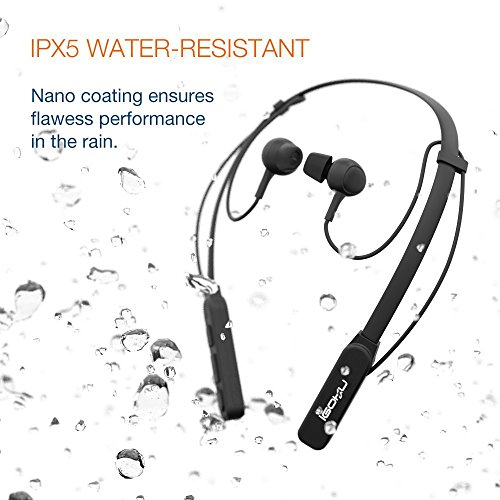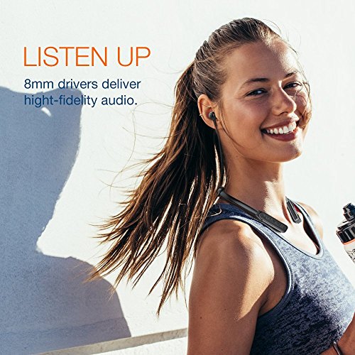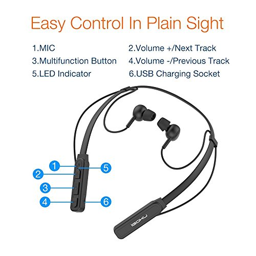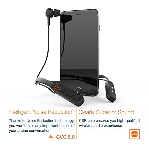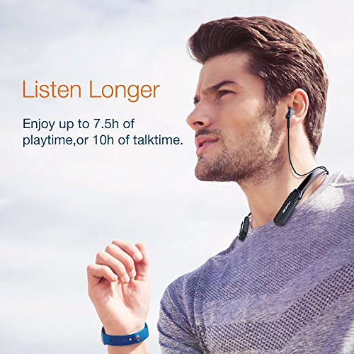 -. Feature : Comfortable Neck-Behind Design. Neck-Behind wearing style provides a comfortable and snug fit and ensures they stay in place during your activities. Button control in the front, easy for you to find and control while wearing it. It weighs only 0.7 oz in flexible and durable silicone neckband, 60% lighter than any other neckband headset, you'll forget you have them on! Flexible and durable material, you could fold and put it in your pocket or handbag, it will not break / High Quality Sound Quality. The soft in-ear buds not only provide comfortable yet secure fit, but also bring you a rich, smooth and clear sound,which gives your ears super enjoyable experience while running, biking or other workout. Hands free calls are available and convenient for you with the built-in mic, you may answer phone calls by just pressing the power button / Noise Cancelling Technology. Featured with CVC6.0 noise cancelling technology, our headphone filters out background noise up to 30dB,which guarantees sound quality and clear voices for calls while you're traveling, working, jogging, etc. It keeps you mind in peace when you are in noisy crowd / Bluetooth 4.1 for Easy Connection. Provides a several-second and stable pairing with your bluetooth enabled device. Offering you impressive dynamic sound even you are 10 meters away from your device / Ultra Long Working Time. Powerful rechargeable battery provides up to 13 hours of continuous talking/music time and 350 hours of standby with one single charge