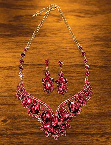 -. Feature : DAZZLING 3 PIECE SET: Fashionable statement jewelry set includes ruby colored faux crystal necklace and earrings / STYLISH: Fashion statement pieces are elegant and brilliant with large faceted stones / QUALITY MATERIALS: Faux rhinestones and acrylic gems; chain 18"l with a 2½"l extender; dangle earrings 3"l / GREAT GIFT FOR: Women, teachers, girls, birthdays, Valentine's Day, Christmas, bridesmaids