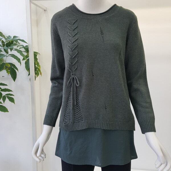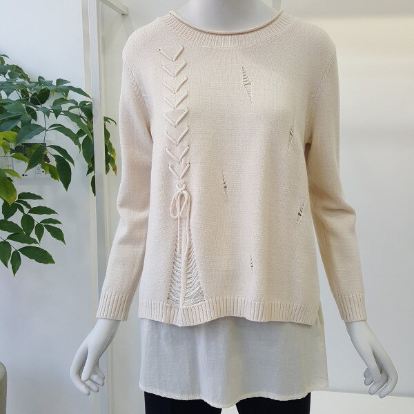 기본 니트 풀오버에 우븐패치가 들어가 레이어드하여 코디해서 입은듯한 디자인으로 멋스럽고 간절기에 입기 좋은 두께 입니다.