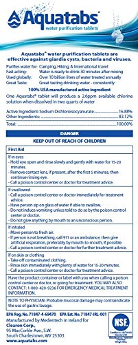 15 billion litres of water were treated using Aquatabs in 2008 alone. Active ingredient (NaDCC): US EPA approved for long term drinking water treatment.
