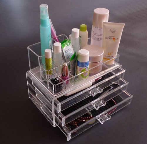 - Feature : Made of clear acrylic, cleans easily with soap and water / Removable black mesh padding keeps jewelry protected and in place. / Completely removable drawers slide out smoothly / Organizes all jewelry and cosmetics in one place.Size: 9 3/8" x 5 3/8" x 4 3/8"H / Accessories not included