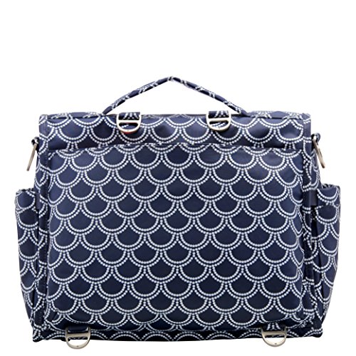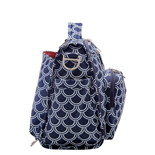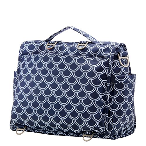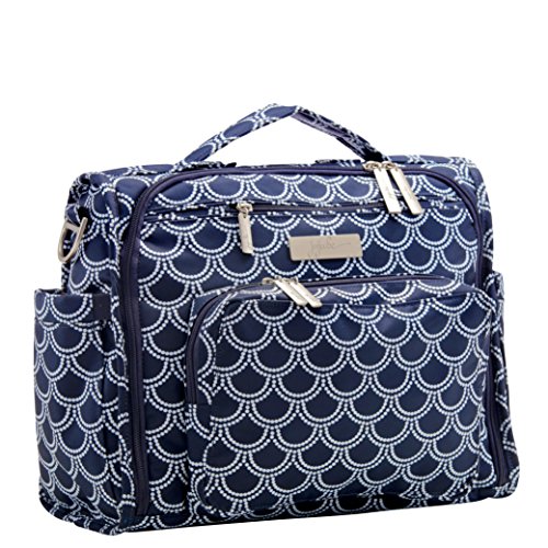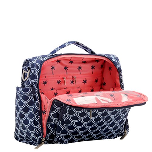 The Ju-Ju-Be Coastal Collection B.F.F. Convertible Diaper Bag provides multiple carrying and storage options to help you stay ultra-organized. Just like your B.F.F., this machine washable backpack is something you cannot live without. Designed with convenience and comfort in mind, this versatile bag can be carried using its top handle, over-the-shoulder strap or backpack straps. The memory foam straps have textured fabric underneath to prevent the bag from slipping off your shoulder. Keep organized and sane, while never sacrificing looking good. The bag's lining is protected with Agion natural antimicrobial treatment, which inhibits and reduces the growth of odor-causing bacteria, mold and mildew. The outer fabric is treated with Teflon fabric protector, so you can repel stains and keep it clean. The front "mommy" zippered pocket is large enough for smartphones, wallets, keys attach to the key fob stretch cord, and other personal items. Inside organization includes (4) gusseted pockets, (3) zippered pockets and lots of wide open space. The main zippered pocket is large enough for diapers, wipes, extra clothes and other items. The back pocket is designed with crumb drains to keep this area clean, is large enough to store your child's books, and includes a super cushy matching memory foam changing pad. Bottle pockets are located on either side of the bag and come insulated with Thinsulate by 3M to keep your items hot or cold. The Newport pattern is a white scalloped pattern on a navy background with navy palm tree print on a pink background for the lining. With the B.F.F. Diaper Bag, you can choose to wear it as a backpack or messenger style - it's your choice. All Ju-Ju-Be Bags come with a Lifetime Limited Warranty against manufacturing defects when purchased from an Authorized Ju-Ju-Be Dealer. Authorized Dealers can be found in the images.Feature