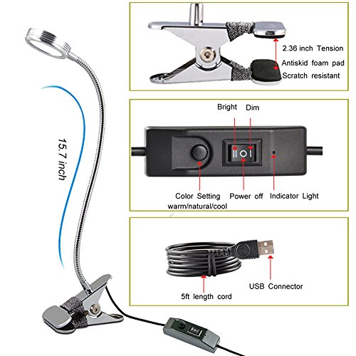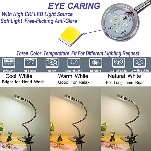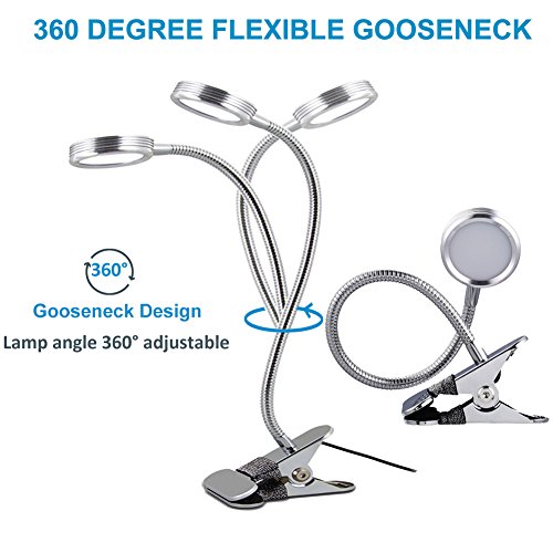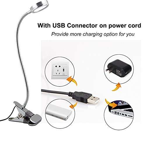 ★【Clip on & 360°Flexible Gooseneck】360° lighting angle adjustment,easy to get the suitable lighting angle for your reading, studying or working.With Stainless Clip,Maxmum expand to 2.36inch, Light can clip on Table, Desk, Bed headboard and Computers.