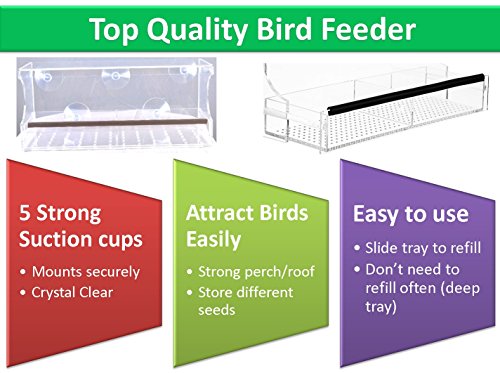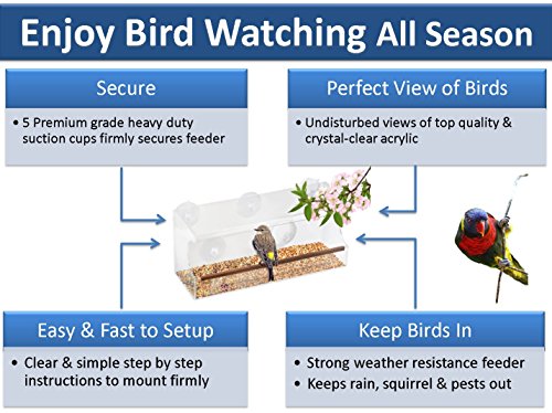 - SET IT ALL UP IN NO TIME: Installs and refills in seconds! 5 suction cups (more than our competitors) that secure the bird feeder even during in extreme weather. You don’t have to take it down often as you can add the bird seeds easily and leave it hanging. Multiple small drain holes to keep the seeds dry and fresh even during rain or snow. We also provide clear tips on how to clean and install properly to get the best results!