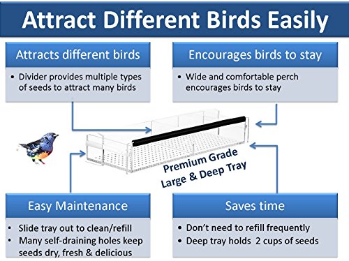 - WITH FRIENDS OR FAMILY- THE VIEW IS ALWAYS AMAZING: Enjoy your morning coffee with beautiful chirping filling the air, bring your family, loved ones or your friends closer to beautiful finches, thistles and other wild birds without ever leaving the comfort of your house. Plus, you have absolutely no worries, as there’s no need to refill regularly because the seed tray is very deep and contains dividers. Get ready for the most beautiful family gatherings and dinners with friends!