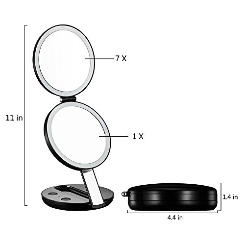 Second-Generation lighted travel mirror: Both of 1x and 7 x mirror With 10pcs LED lights. Long press the button to dimming or brighten lights.
