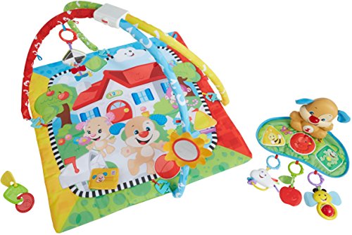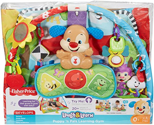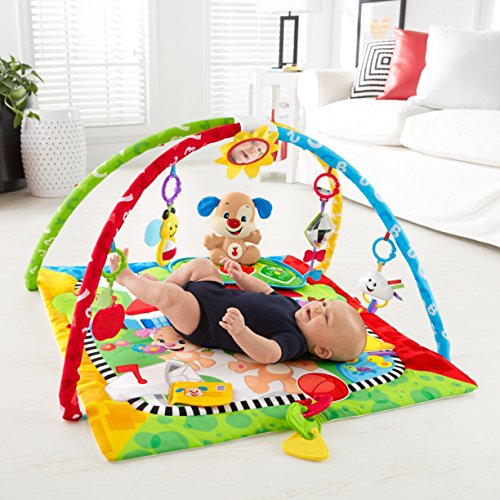 -. Feature : 2 music settings Look & Listen - Perfect for newborns and younger babies. Explore & Discover - Baby is rewarded with first words, fun sounds & simple phrases for batting at the action pad / Take-along Puppy with soft activation pad & light-up nose that "dances" to the music / 6 repositionable activity toys: kite rattle, sun mirror, clacker cloud, bee spinner, apple teether, and linking shapes / You've got mail A piece of mail in the mailbox on the mat makes fun "crinkle" sounds / 2 soft removable arches