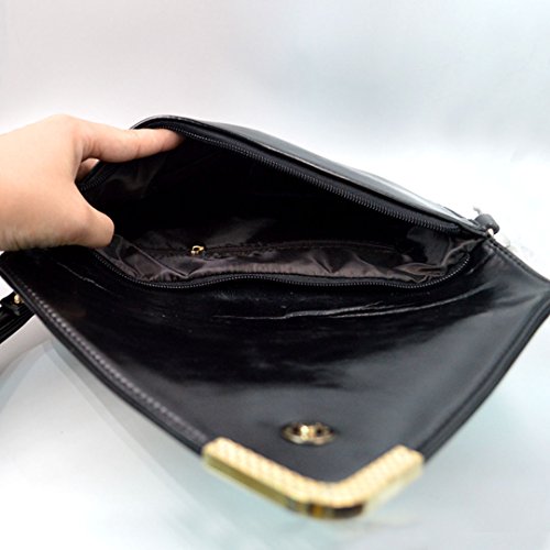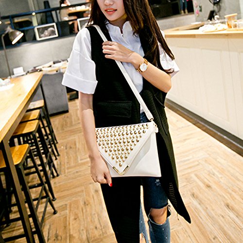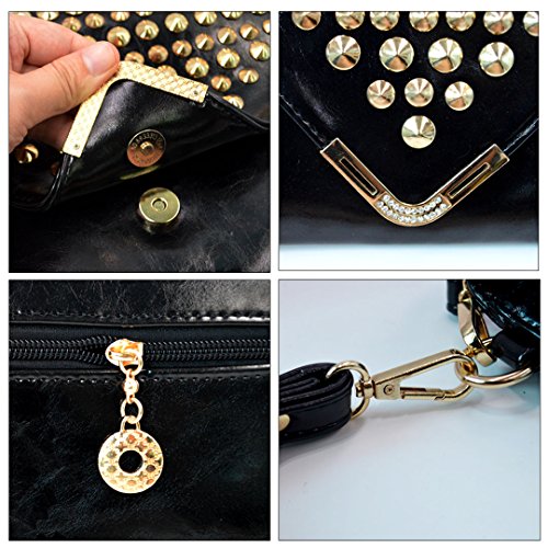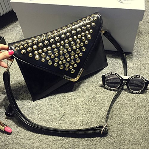 -. Feature : Material: PU leather, poly-cotton lining / Purse Dimension (L*W): 28*19cm/11*7.5in, Perfect size to use everyday / Closure: Zippered opening with Envelope style flap over top secured with two magnetic snaps / Studded with rivets, elegant style with a touch of punk sense; removable wristlet and adjustable shoulder strap, very fancy and practical handbag for girls / Ideal for weddings/parties or night outs, also good partner for work, shopping, dating.