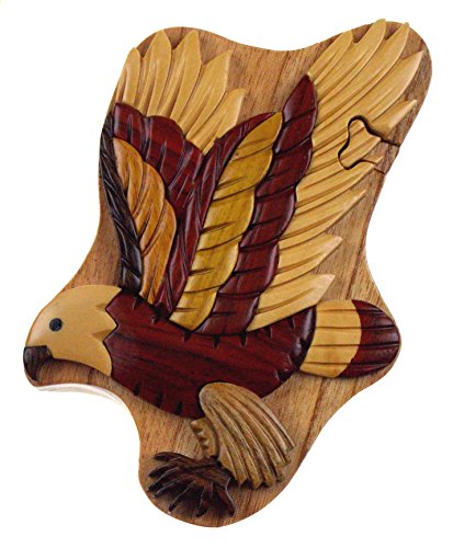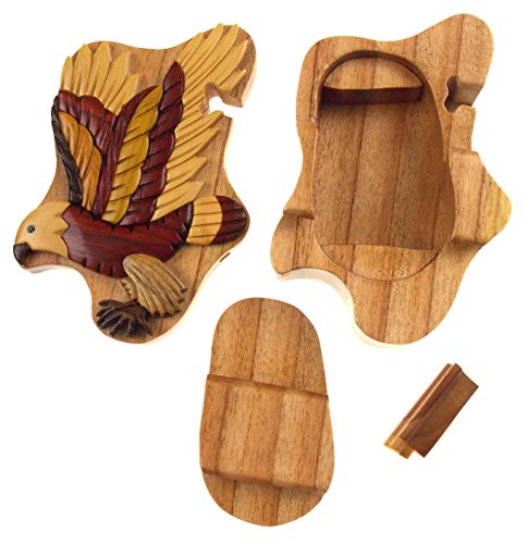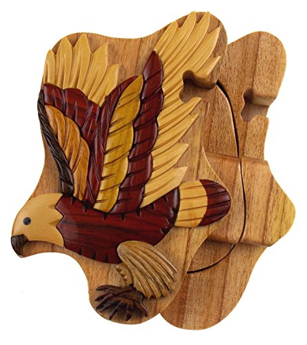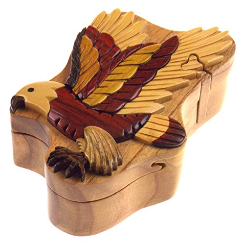 Studio : Hickoryville Publisher : Hickoryville Binding : Kitchen Product Description Handmade carved Flying Eagle wood intarsia puzzle box bundled with Hickoryville instructions on opening and closing the puzzle box. This secret puzzle box is a beautifully handcrafted creation, high quality workmanship, made of natural wood. The box is a puzzle that comes apart into four pieces and discovers a secret space to keep special treasures. Inside storage space is approximately 2.6 inches long x 1.6 inches wide. Every box is a unique, handcrafted creation and yours may vary slightly from the photos. 0