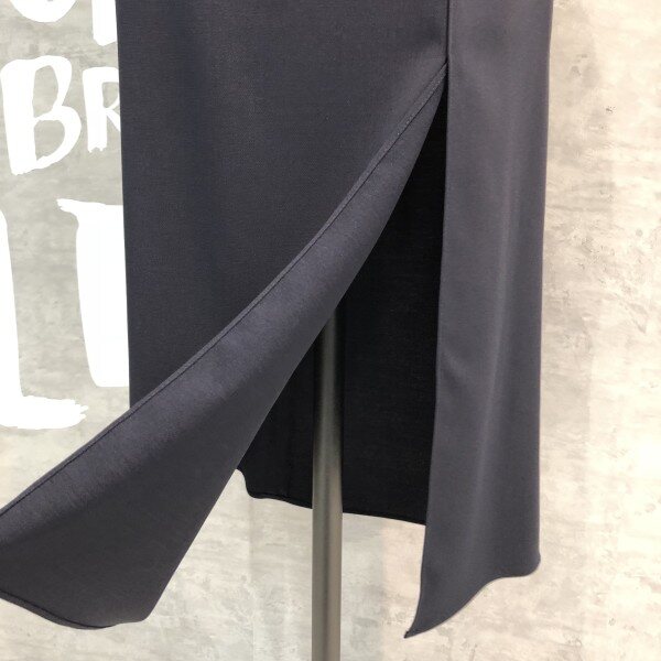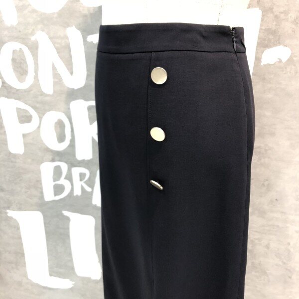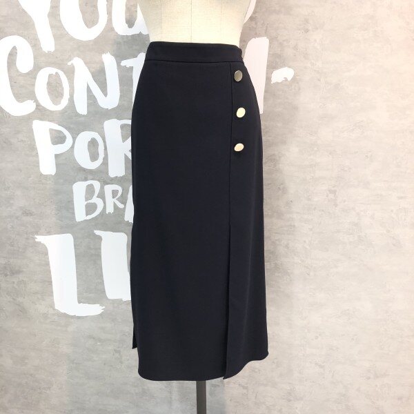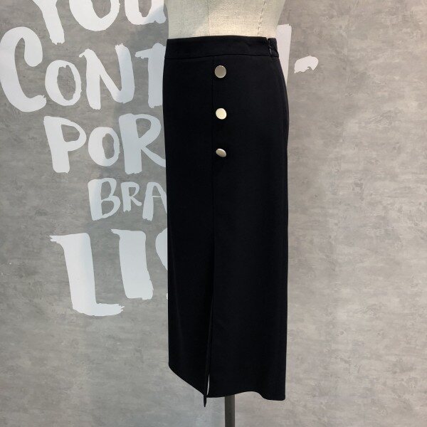 랩라이크 실루엣과 슬릿 디테일이 여성스러운 버튼 포인트 미디 스커트입니다