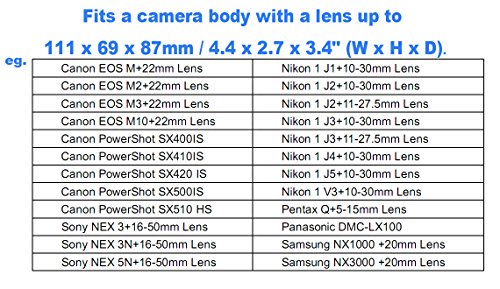 Will accommodate a camera body with a lens up to 111 x 69 x 87mm / 4.4 x 2.7 x 3.4" (W x H x D). This series camera pouches are mainly suitable for Mirrorless Cameras and Advanced Zoom Compact Cameras