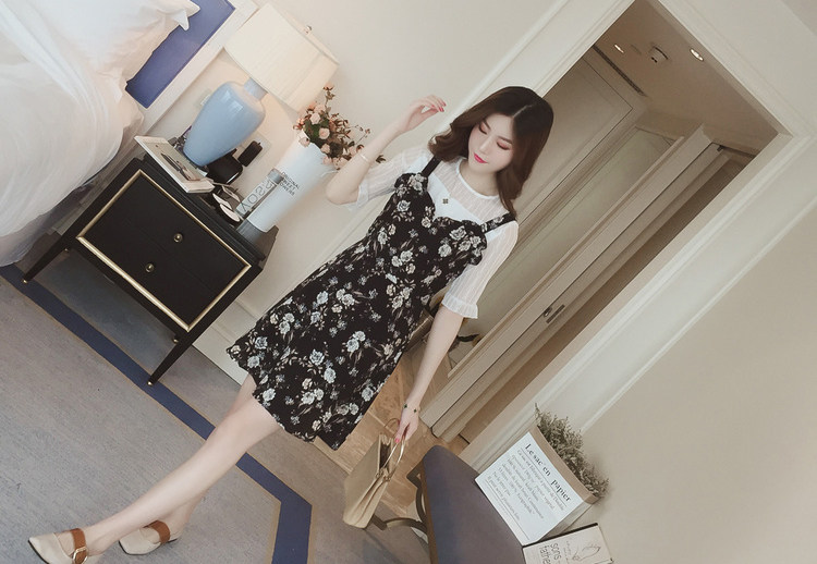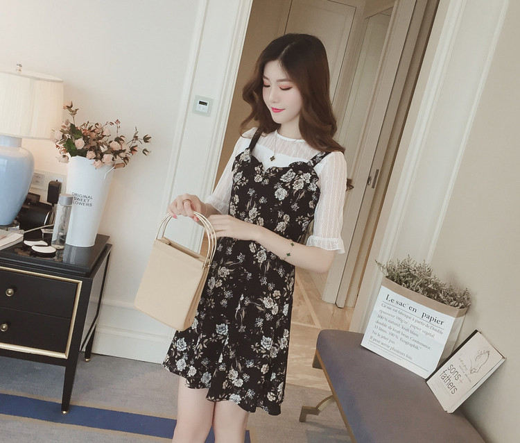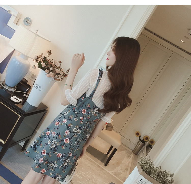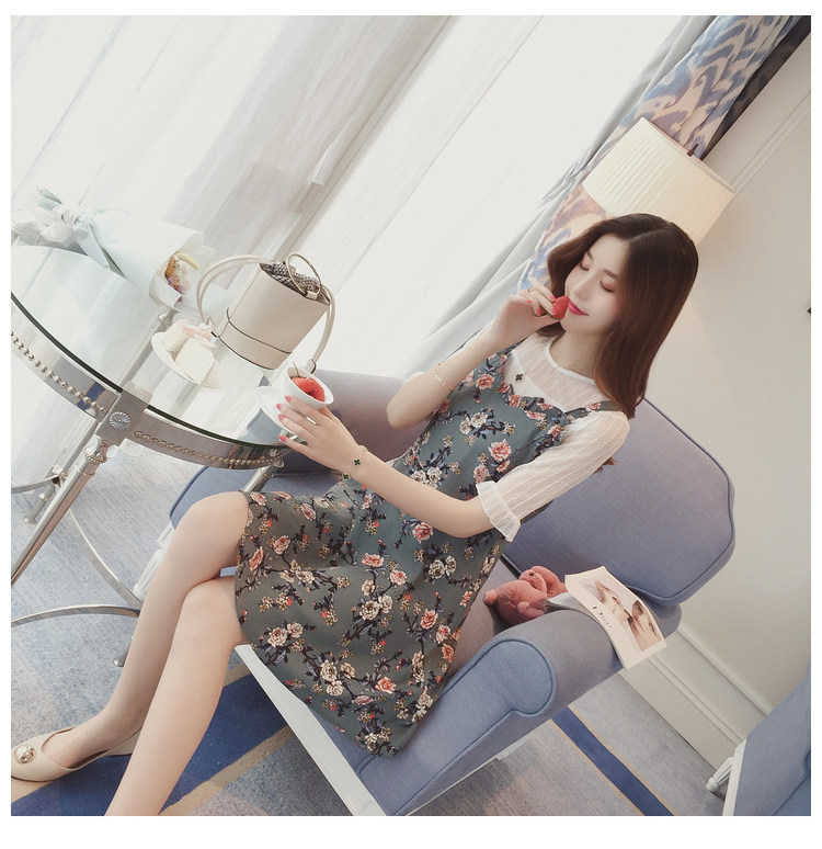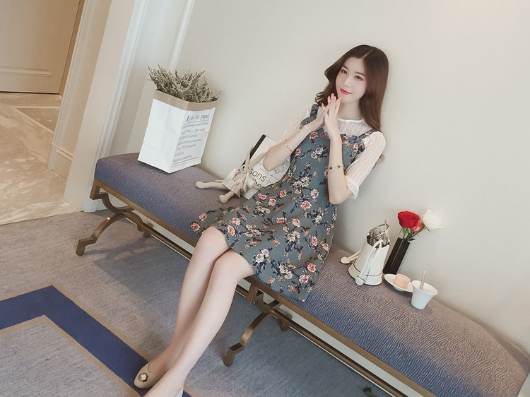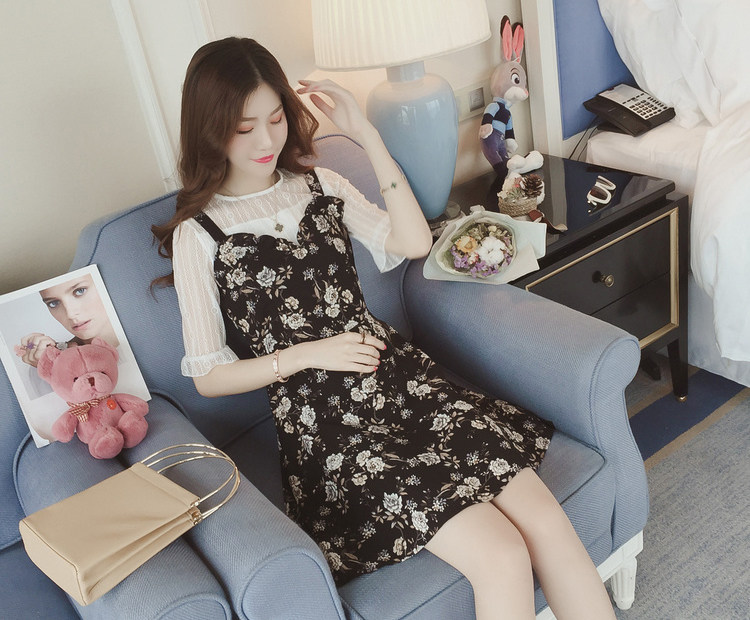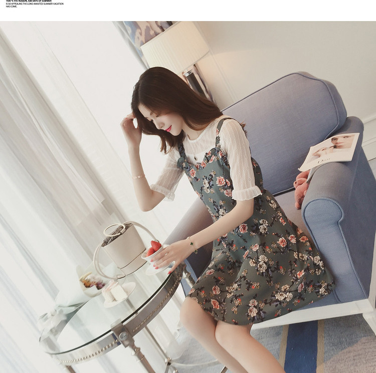 孕妇夏装套装新款潮妈韩版蕾丝短袖碎花时尚怀孕吊带裙两件套