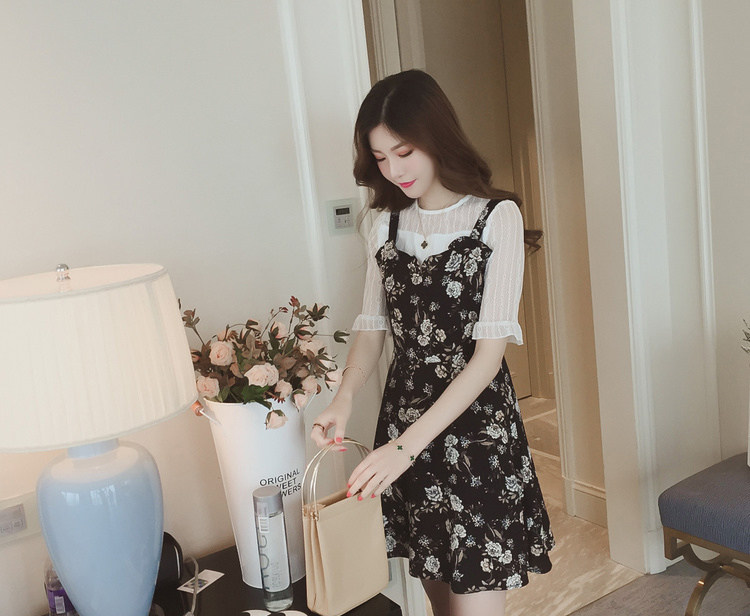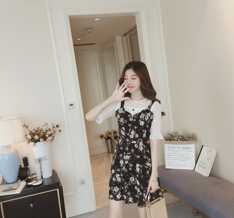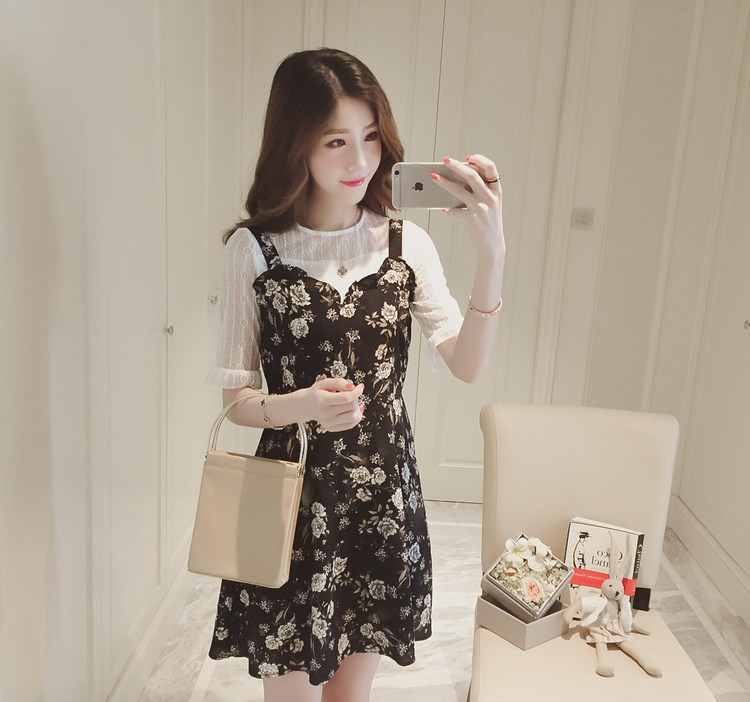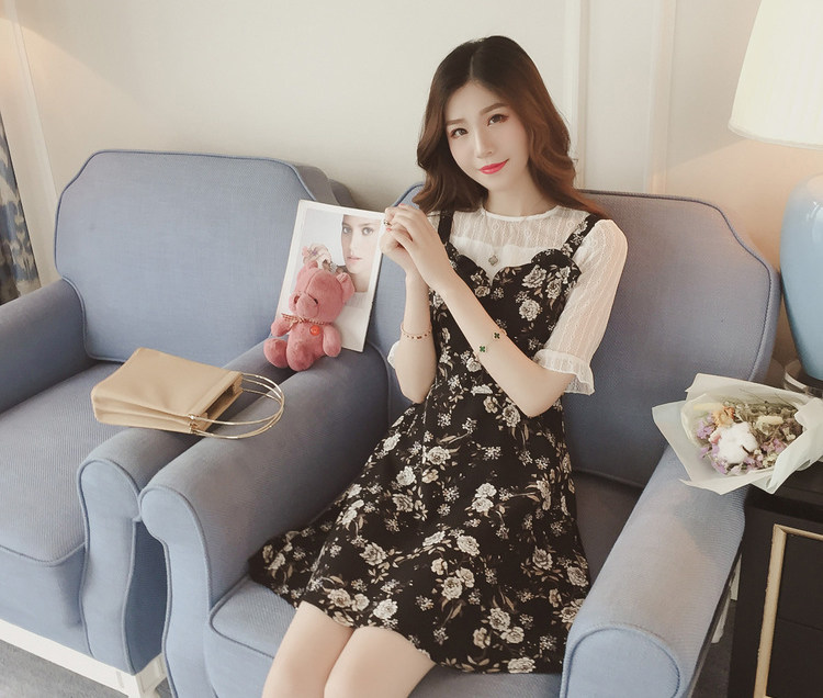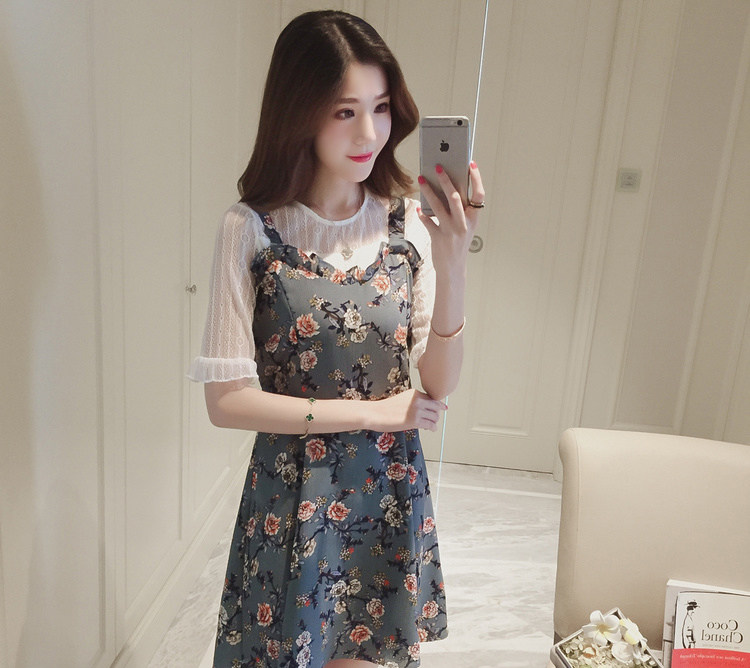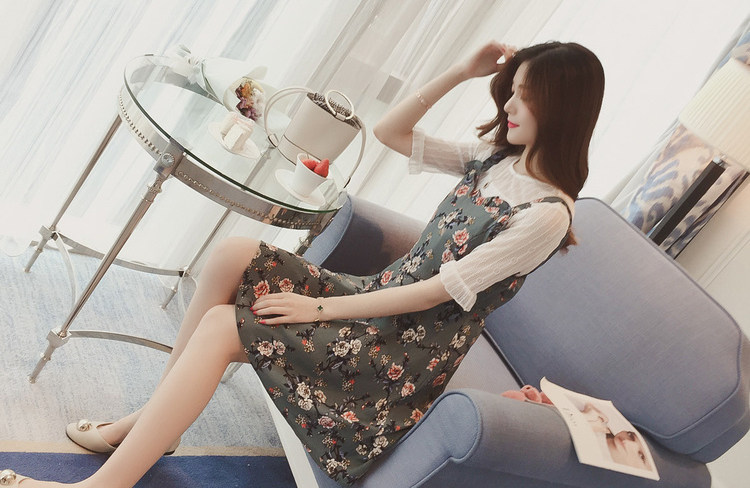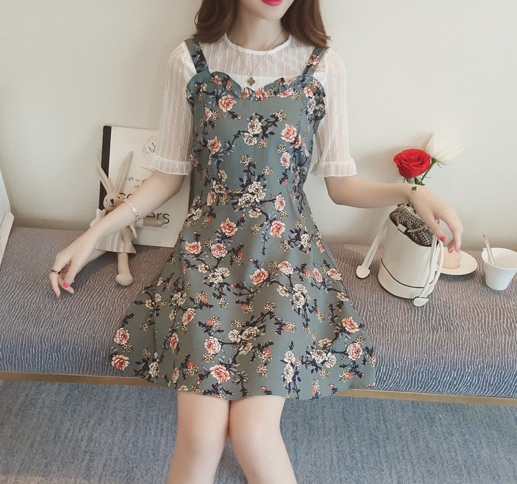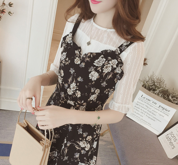孕妇夏装套装新款潮妈韩版蕾丝短袖碎花时尚怀孕吊带裙两件套