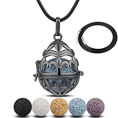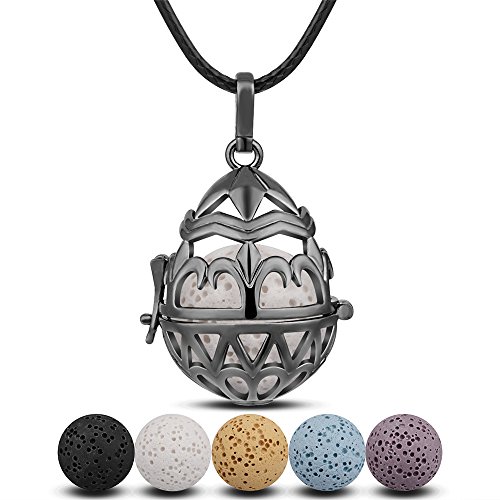 INFUSEU Teardrop Gunmetal Necklace Lava Stone Aromatherapy Diffuser Locket Fleur-De-Lis Pendant + 5PCS Rock Beads + 2PCS Wax Cord Black Rope for...