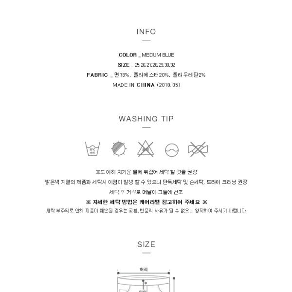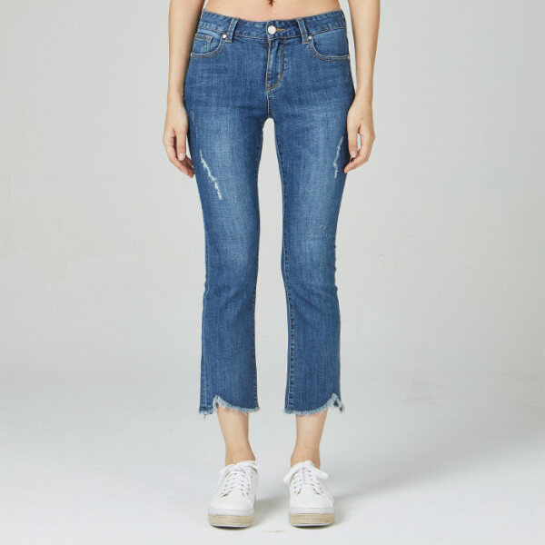 흡습성이 뛰어나 땀을 빨리 배출시켜 시원함을 느낄 수 있는 쿨맥스 소재로 MB톤 인디고 칼라에 바이오스톤과 약간의 구제 워싱이 들어갔고, 밑단 컷팅에 변형을 준 여성 슬림 NE핏 데님 스타일.