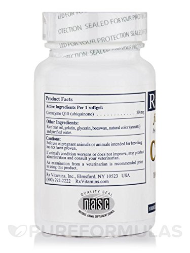 -. Binding : Misc. -. Brand : RX VITAMINS FOR PETS -. EAN : 0708429080039 -. Feature : May work to protect your pet's cells from free radical damage / Each bottle of Rx Vitamins for Pets' CoQ10-30 for Pets contains 30 soft gel capsules / Could potentially help your dog or cat stay active throughout his or her lifetime -. Label : RX VITAMINS FOR PETS -. Manufacturer : RX VITAMINS FOR PETS -. PackageQuantity : 2 -. ProductGroup : Pet Products -. ProductTypeName : PET_SUPPLIES -. Publisher : RX VITAMINS FOR PETS -. Studio : RX VITAMINS FOR PETS -. Title : Rx Vitamins COQ10-30 for Pets, 30 Softgels, 2 Pack -. UPC : 708429080039