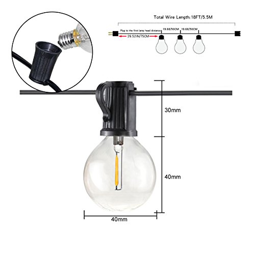 Super Energy Saving: Stand 18.3Ft 10 E17 Sockets with 12 0.6W G40 LED Edison Filament Bulb(2 bulbs for spare), less power consumption than tradition incandescent bulb or halogen bulbs, set 1.64 feet apart. Connect up to 30 strands end to end, save effort and maintenance costs on changing bulbs frequently