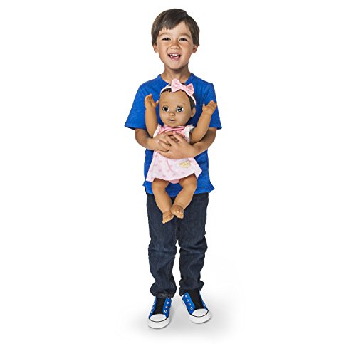Discover so many real baby surprises with Luvabella! From the moment she opens her eyes and giggles, Luvabella will amaze you with her true-to-life facial expressions and personality! She moves, talks and plays just like a real baby. Through touch and play she affectionately responds to your love! Cover her eyes for a game of peek-a-boo, tickle her tummy and toes to make her giggle, or place a hand on her chest to gently listen to her heartbeat. You can even hold her feet to hear her say “mama” and begin to babble! The more you play with her, the more she’ll talk! Her babble will transform into over 100 clear words and phrases! Caring for Luvabella is fun with her four interactive accessories! Use her spoon to feed her and she’ll chew with delight! If she’s not full, she may ask you for more! After her meal, help Luvabella learn new animal names and sounds with her Lamby toy! If she gets fussy, all she needs is her soother. When it’s time to go to bed after a big day of play, lull her to sleep with her bottle. Get to know all of Luvabella’s real baby surprises! Bring love home today!Feature