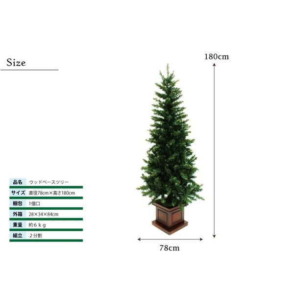 木製ポットを使用したスリムクリスマスツリー!ウッドベーススリムツリーサイズ 直径78cm×高さ180cm梱包  1個口外箱  28cm×34cm×84cm