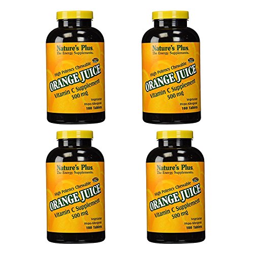 Studio : Nature's Plus Publisher : Nature's Plus Binding : Health and Beauty Product Description Orange Juice C 500mg by Nature's Plus 180 Chewable Orange Juice C 500mg 180 Chewable Product There's a reason why Vitamin C is the most well-known and highly regarded vitamin in the world This antioxidant affects many of the body's systems including the vascular system and natural defenses. These tangy and delicious chewables are a delightful source of daily Vitamin C. Suggested Use As a dietary supplement chew one tablet daily - Or as directed by your healthcare professional. Supplement Facts Serving Size 1 Chewable Tablet Servings Per Container 180 Amount Per Serving Daily Value Calories 10 Total Carbohydrate 2 g 1 Sugars 2 g Vitamin C (as ascorbic acid) 500 mg 833 Percent Daily Values are based on a 2 000 calorie diet Other Ingredients Fructose natural orange flavor magnesium stearate silica beet juice natural color natural orange juice pulp orange juice crystals orange exocarp lemon bioflavonoids (from Citrus limon fruit) rutin hesperidin acerola cherry (Malpighia glabra fruit) ro 0