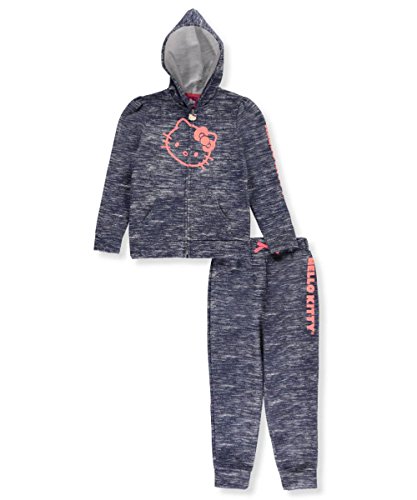 Cute and comfy, this fleece sweatsuit from Hello Kitty is sure to sweeten up her look! Hello Kitty 2-piece fleece sweatsuit Fleece hoodie with glittery thread accents, chest graphic, split kangaroo pocket, and zipper closure (52% cotton, 40% polyester, 8% lurex) Fleece joggers with glittery thread accents, graphic at leg, and elastic waistband with tie accent (52% cotton, 40% polyester, 8% lurex) Machine wash cold, gentle, inside out ImportedFeature