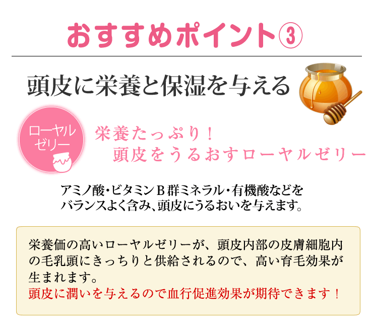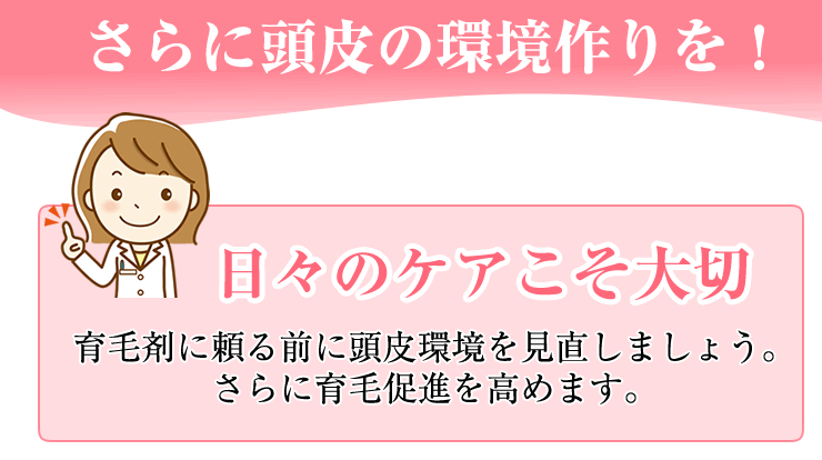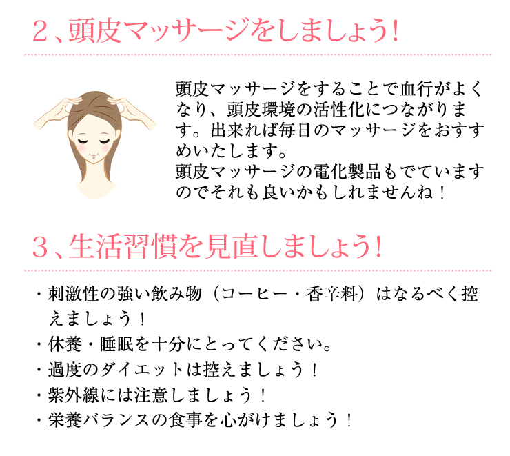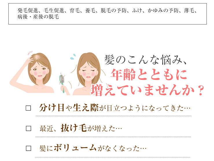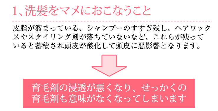 ・洗髪後は、水分をよく拭き取ってからご使用ください。 ・頭皮にまんべんなく行き渡るように使用し、指先で軽く頭皮マッサージをすることにより、血行と薬剤の浸透をよくします。 ・適量を毎日根気よく使用してください。続けてご使用いただくことが効果を高めます。 |