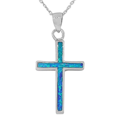 -. Feature : Length (inches):18 / The pendant showcases an elegant design displaying a Latin cross positioned vertically and shining with gorgeous turquoise-tone fire opal accents. The necklace is crafted of sterling silver. Get it for your loved one or treat yourself for a classic timeless style. The delicate yet durable link chain measures 18.00in long and locks with a sP.R.Ing ring type of clasp for extra security.
