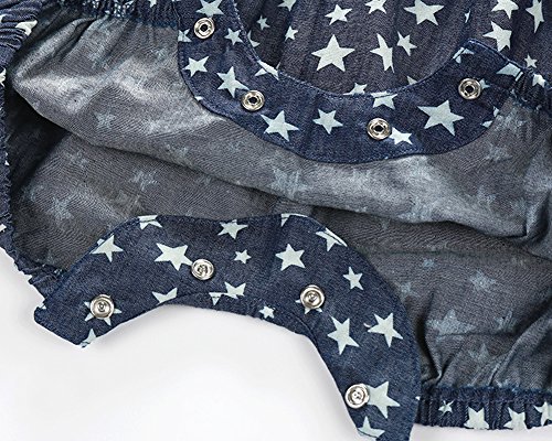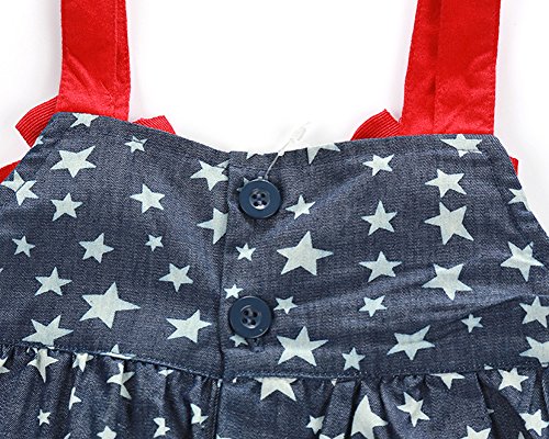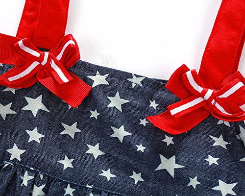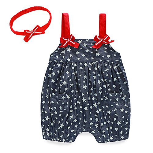 -. Binding : Apparel -. Brand : Faithtur -. Color : Red -. Department : baby-girls -. Feature : Soft and comfortable material for babies / Cute design: Stars P.R.Int on the blue denim fabric ,and red straps with matching headband for girls / With buttons on crotch, easy to put on and off. / Suitable for baby girls 0-2 years / 1* denim romper + 1* headband -. ProductGroup : Apparel -. ProductTypeName : SHIRT -. Title : Baby Girls Stars Denim Strap Romper Jumpsuit Outfit With Red Headband 0-2 Years