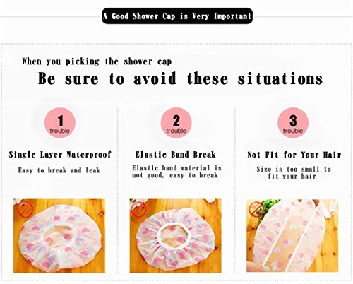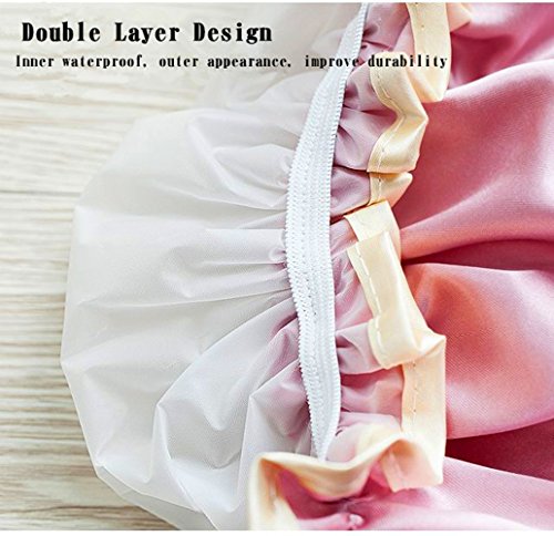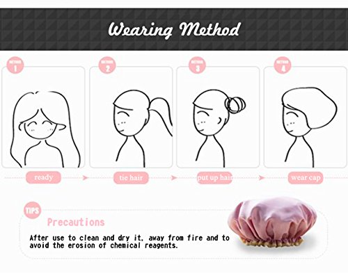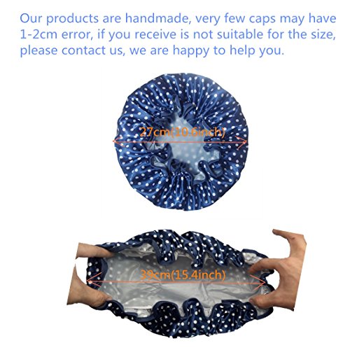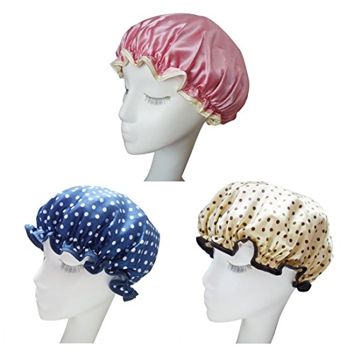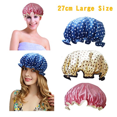 Product Description: Polyester silk + elastic band; Size: about 25cm - 27cm (top diameter) X about 12CM (elastic diameter) The hat has a good feeling for your daily use; this hat is super effective, very durable and very comfortable The edge of the elastic double and wide top can make you long curly hair. Package includes: 3X shower capFeature