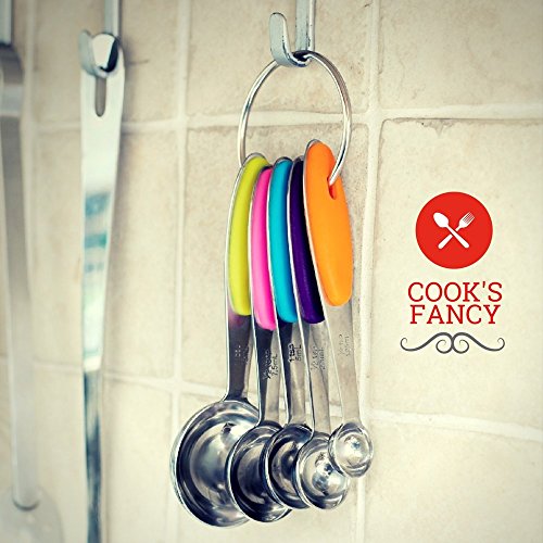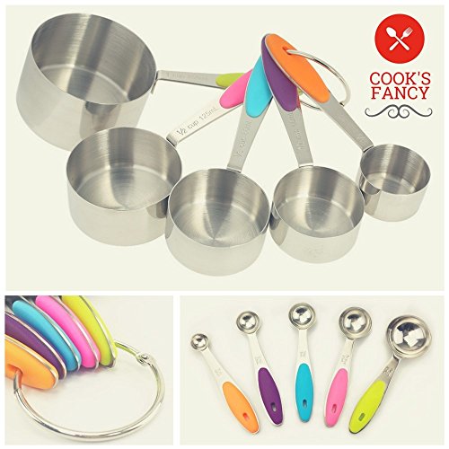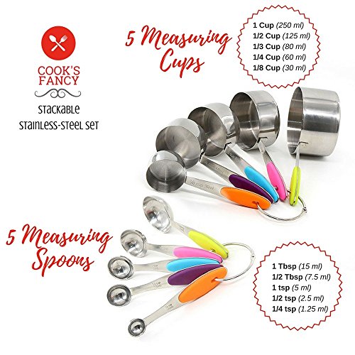 - HIGH QUALITY MEASURING SET – The Cook’s Fancy Measuring Set Includes 5 CUP SIZES (1 cup, 1/2 cup, 1/3 cup, 1/4 cup, 1/8 cup) and 5 SPOON SIZES (1 Tablespoon, 1/2 Tablespoon, 1 teaspoon, 1/2 teaspoon, 1/4 teaspoon). Our measuring cups and spoons also come with a detachable silver ring so they can be stacked in a drawer or hung in a bundle for effortless, space-saving storage. This design makes it so easy to find the right cup and spoon the first time, every time!