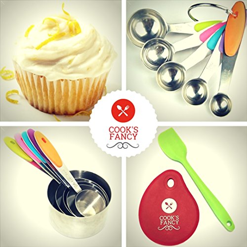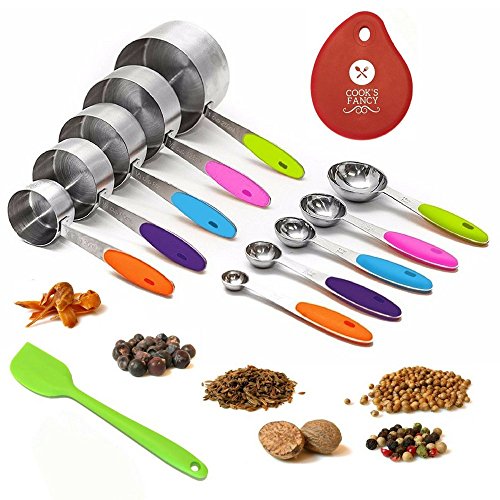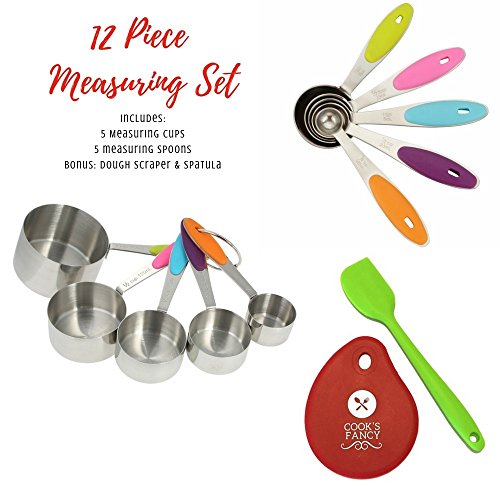 Cook's Fancy 12-Piece Stainless-Steel Measuring Cup & Spoon Set with Colorful Silicone Handles, Bonus: Dough Scraper & Spatula