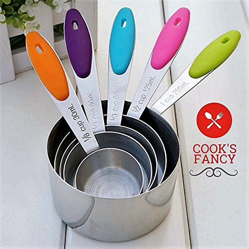 - DURABLE STAINLESS-STEEL WITH NON-SLIP GRIPS– Made of strong, high-quality stainless-steel, our shiny measuring set is dishwasher safe, rust-resistant and made to last. Each measuring cup has a flat bottom which allows it to rest on your counter and not tip over when filled. The bright silicone handles are comfortable to hold and specially designed to be anti-slip and heat-resistant. This colorful set matches any decor and is a great addition to any cook’s kitchen.