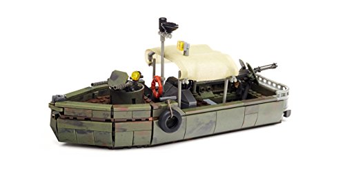 Buildable camo Riverboat with pivoting turret gun, fabric tarp, and accessible engine