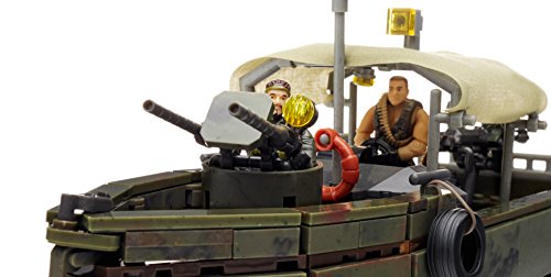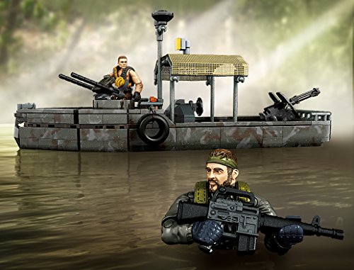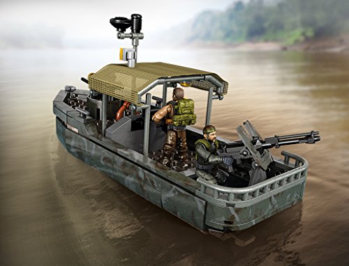 Build the Call of Duty Riverboat Raid collector construction set by Mega Bloks. Used to navigate the jungle’s shallow waterways, river patrol boats relied on heavy armaments to take out concealed targets. Build the gunboat, and man the deck when you set Master Sergeant Frank Woods or his fellow Marine at the pivoting turret gun, or load up with the working missile launcher. Featuring a real fabric tarp and accessible engine, this classic camouflage watercraft comes with detailed accessories like a tire, gas can, life preserver and barrel. Set the scene, then gear up, using classic military-themed weapons and accessories to outfit your soldiers for an assault in the heart of the jungle.