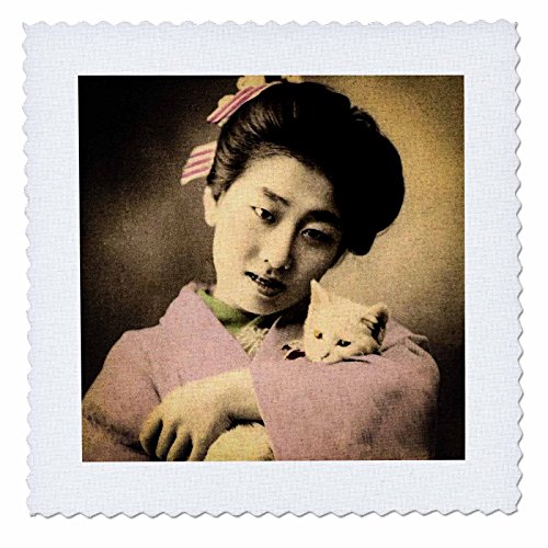 3dRose Vintage Hand Colored Young Japanese Geisha and Her Pet Kitten Quilt Square, 8 x 8"