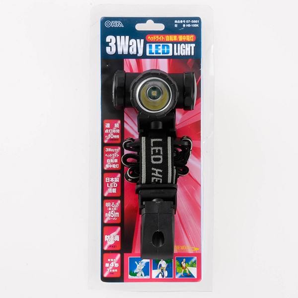 | 自転車・ヘッドライト・懐中電灯と3通りの使い方ができるヘッドライトです。明るさは約45ルーメン(約1.0W)です。プッシュスイッチ採用。 |