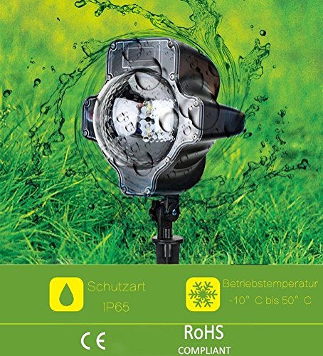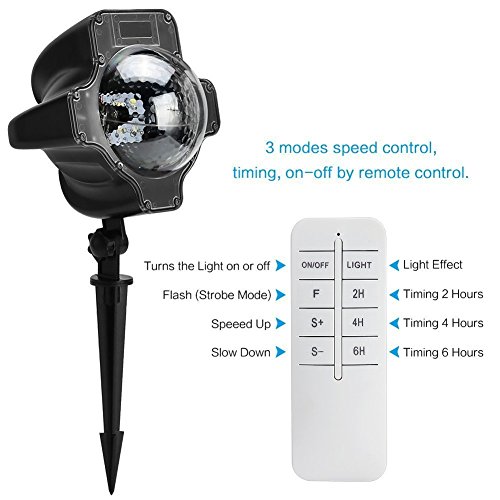 - RF Remote Control -- Multi-functional remote control (Battery Included), With our wireless RF controller from up to 50ft away, you can change different modes such as Button "F"--Flash Setting, Strobe or Normal Mode can be applied to Led Flurries Lights. Button "S+/S-" for Speed Up/Down. Button "2/4/6H" for Timer, Sets the waterproof garden projector light on a 2/4/6 Hours on, 22/20/18 Hours off Daily Cycle
