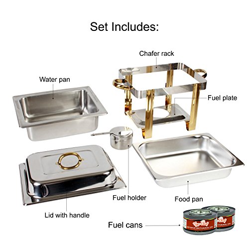 - The set includes a 4 quart, half-size water pan, food pan, lid with handle, chafer rack, fuel holder,fuel plate, and fuel gels