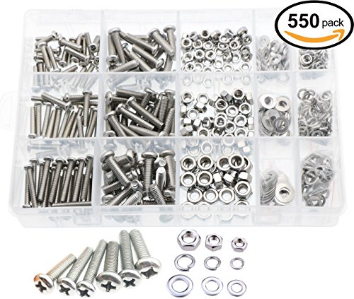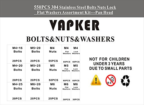 VAPKER 550 Pcs M4 M5 M6 Pan Head Stainless Steel Screw Bolts Nuts Lock and Flat Gasket Washers Screws Assortment Kit