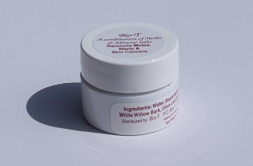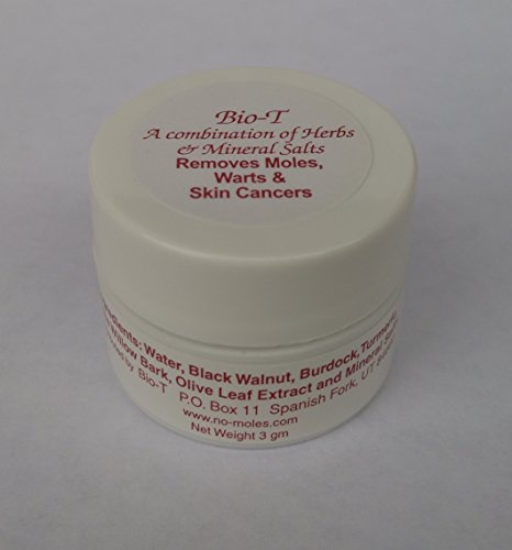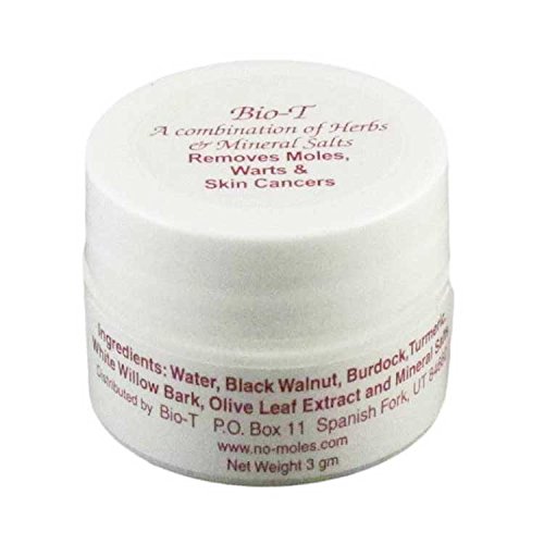 Studio : Bio-T Herbals Publisher : Bio-T Herbals Binding : Misc. Product Description Bio-T Topical Ointment is a combination of several well-known therapeutic herbs and mineral salts used to remove moles, warts, skin tags and skin tags. It is a dark colored paste and is used topically to eliminate skin lesions. Contains enough to treat and remove 6 or 7 moles or 4 or 5 warts or skin tags Note: If you are ordering the topical application to remove moles, warts, or skin cancers please consider ordering the Revitalizing Creme to assist in the healing process and to minimize the possibility of scarring. 0