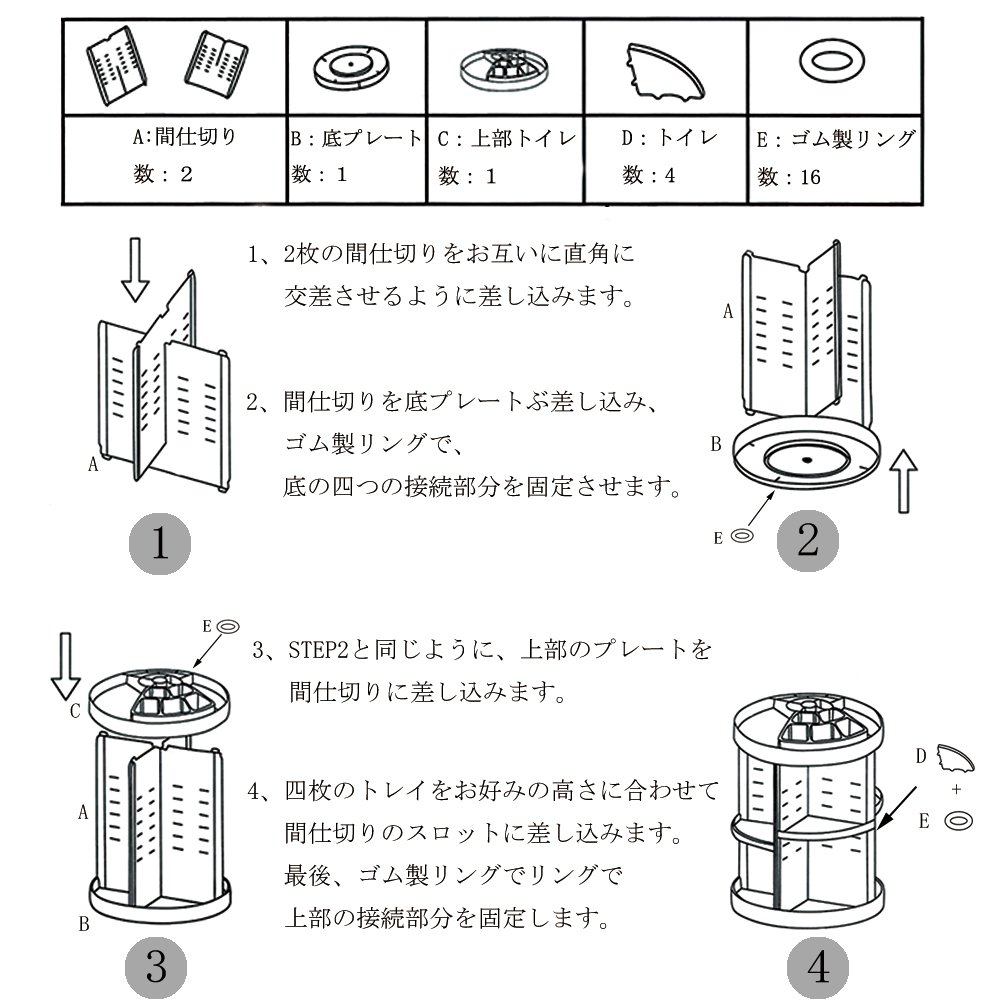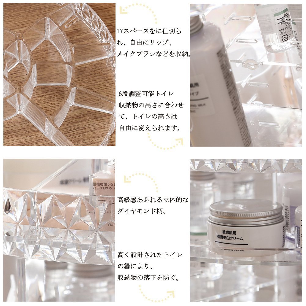 When using this six-layer rotary stand in a tray, it is possible to adjust the height of each tray according to the height of the product by assembling the stand according to the interlock and position of the small shelf, which is suitable for storage